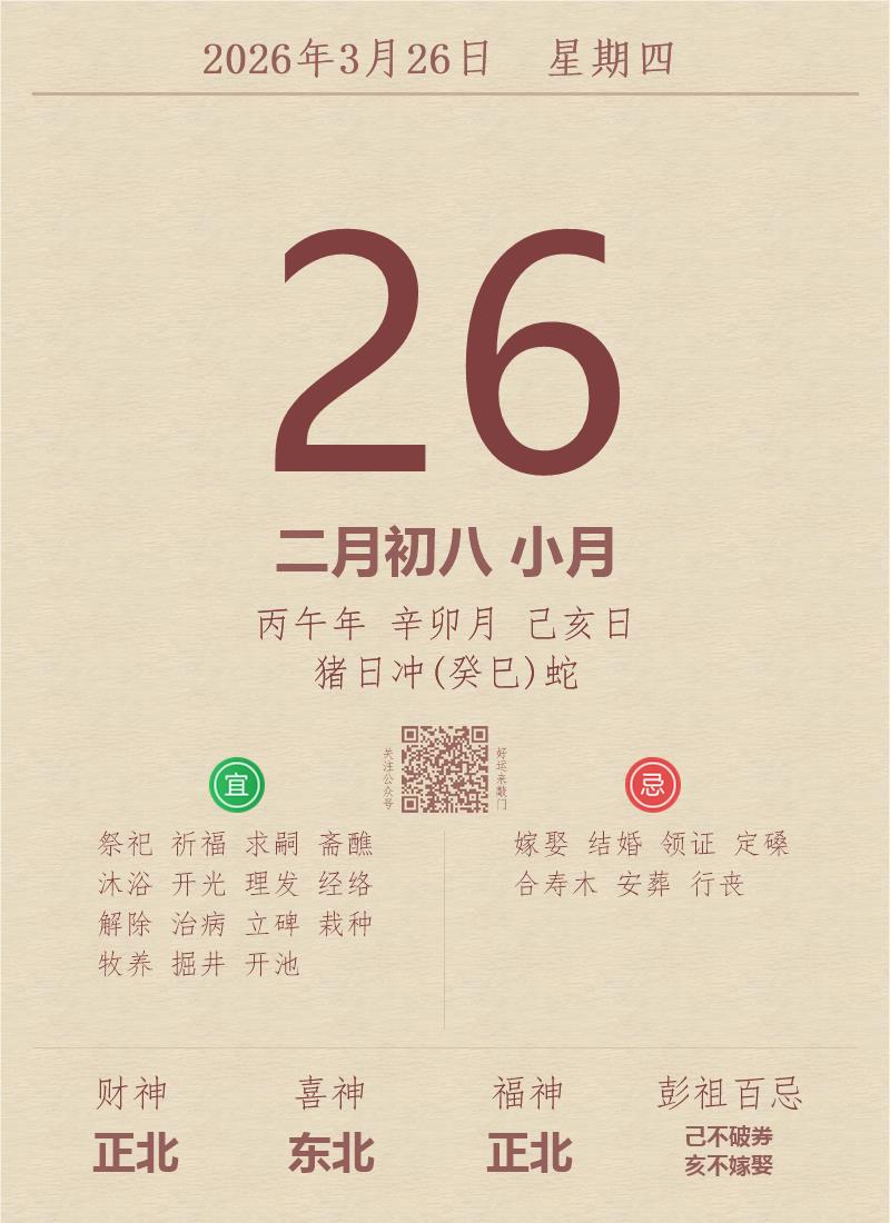今日老黄历(2026年3月26日):黄历宜忌、财神方位、特吉生肖、打麻将财位