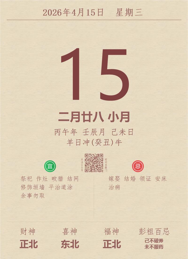 今日老黄历(2026年4月15日):黄历宜忌、财神方位、特吉生肖、打麻将财位