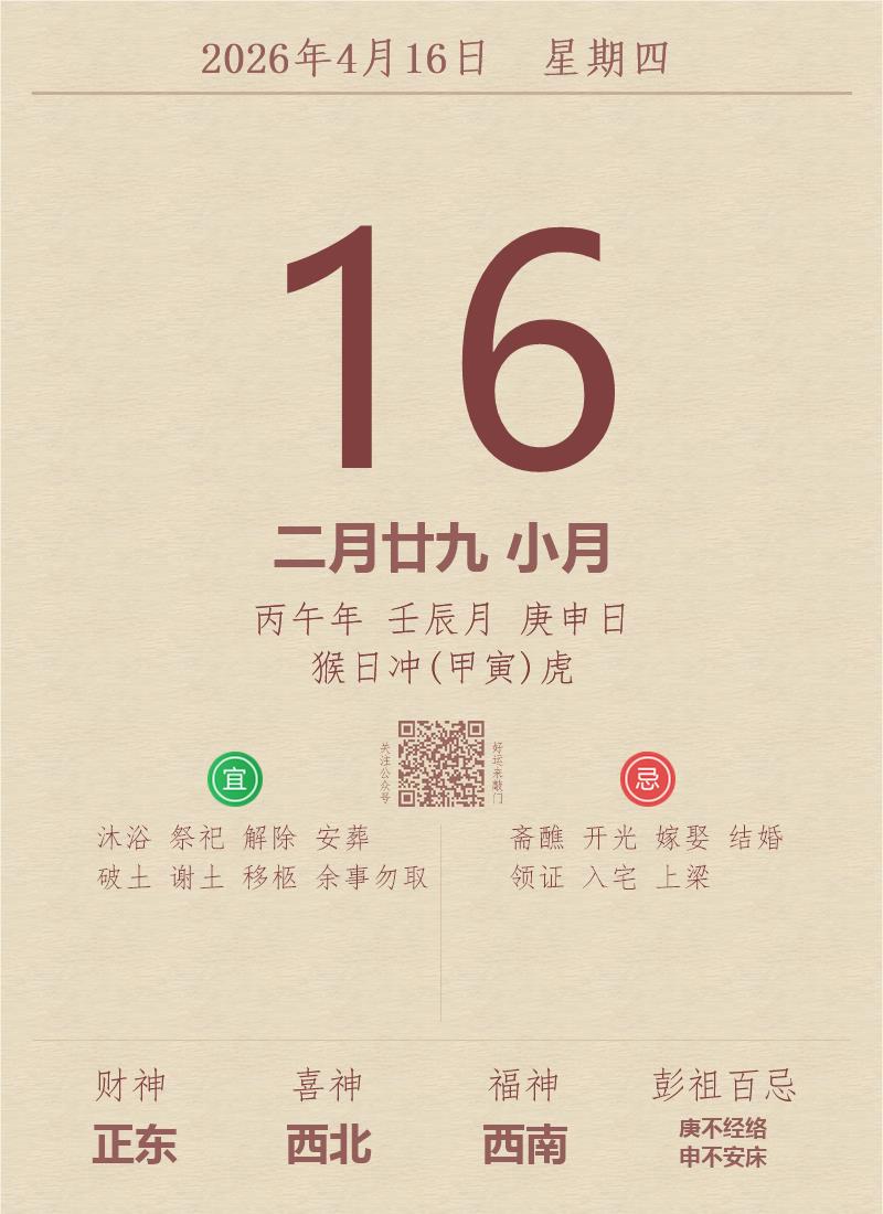 今日老黄历(2026年4月16日):黄历宜忌、财神方位、特吉生肖、打麻将财位