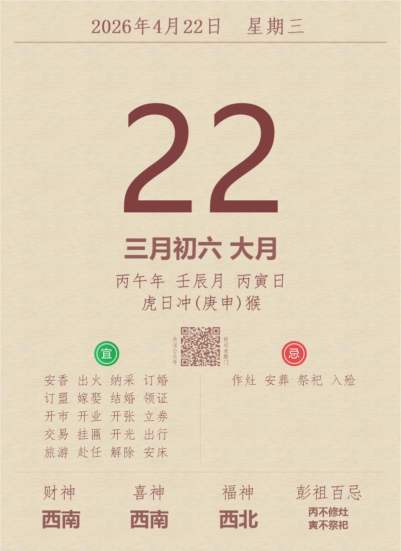 今日老黄历(2026年4月22日):黄历宜忌、财神方位、特吉生肖、打麻将财位