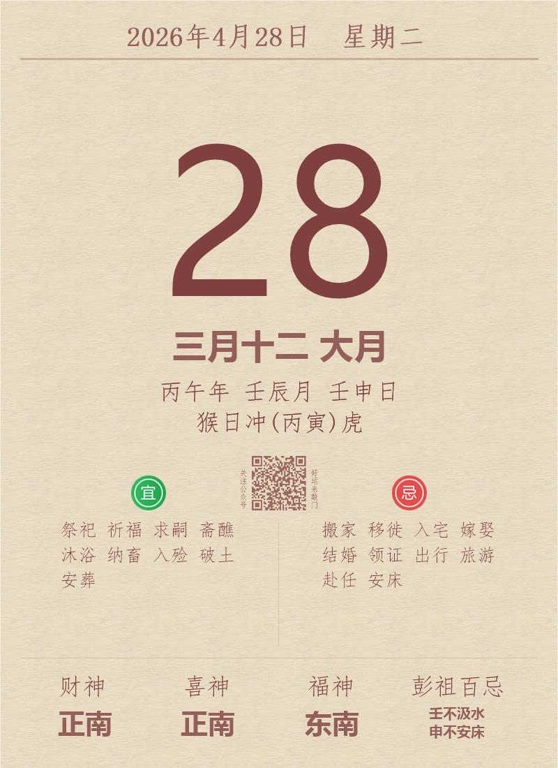 今日老黄历(2026年4月28日):黄历宜忌、财神方位、特吉生肖、打麻将财位