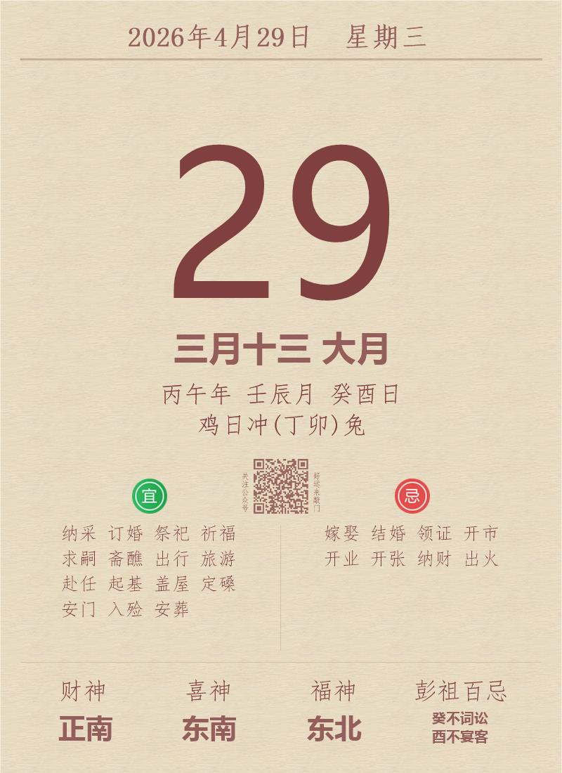 今日老黄历(2026年4月29日):黄历宜忌、财神方位、特吉生肖、打麻将财位