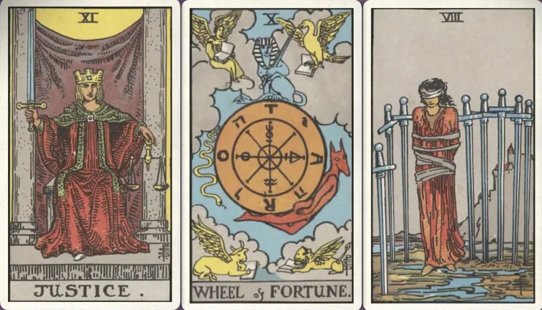 牌:正义+ 命运之轮+ 宝剑八+