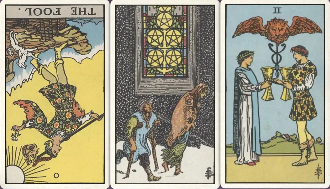 牌:愚人- 星币五+ 圣杯二+