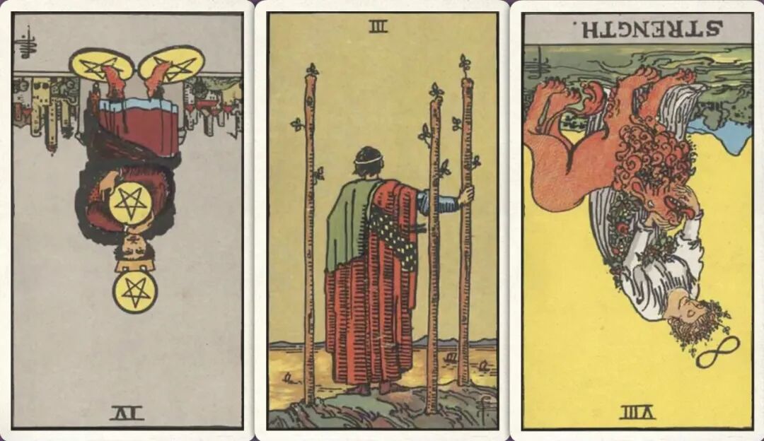 牌:星币四- 权杖三+ 力量-