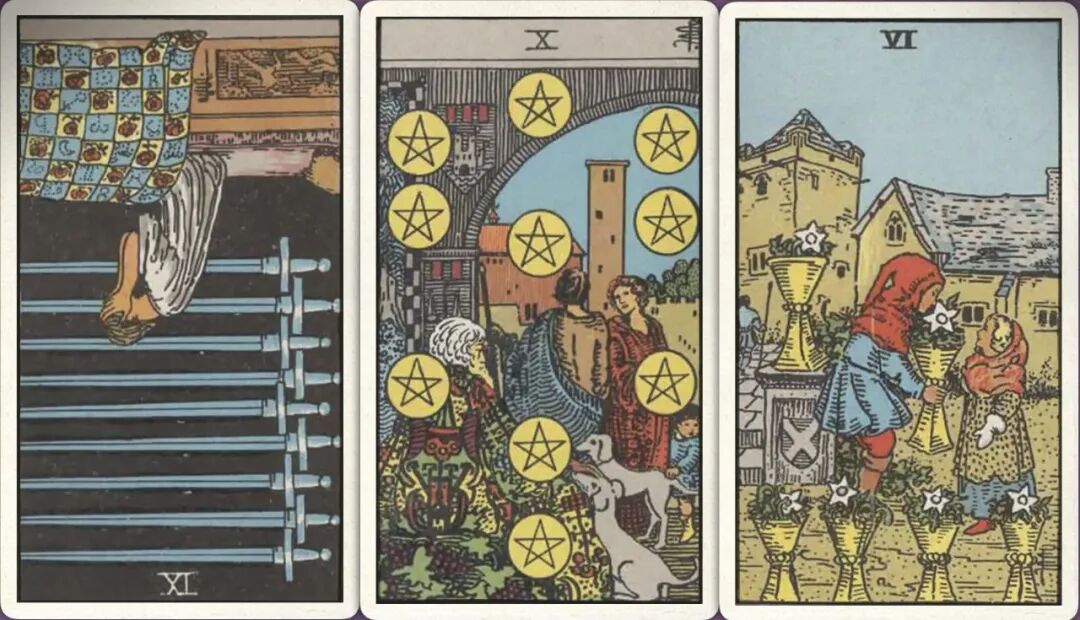 牌:宝剑九- 星币十+ 圣杯六+