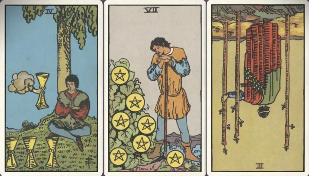 牌:圣杯四+ 星币七+ 权杖三-
